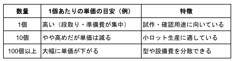 10個なのか1000個なのかで単価は大きく異なります。少量だと段取りのコストが響き、1個あたりの費用が割高になります。
